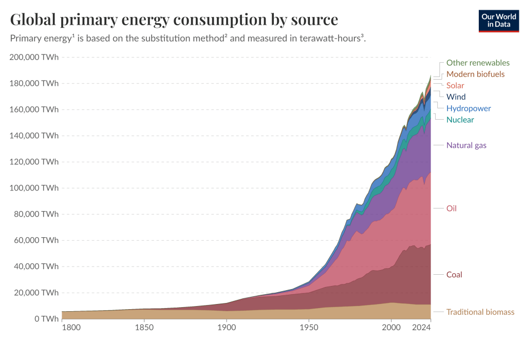 We use a lot of power. In 2024, it was estimated that globally, the primary energy consumption was 186, 383 TWh. Simply put, one TWh, or one Terawatt-hour, is the equivalent of one trillion, yes one TRILLION watts of energy used within the of span one hour. If you start to do the math, that is a lot of energy-efficient 10 watt LED light bulbs per person.