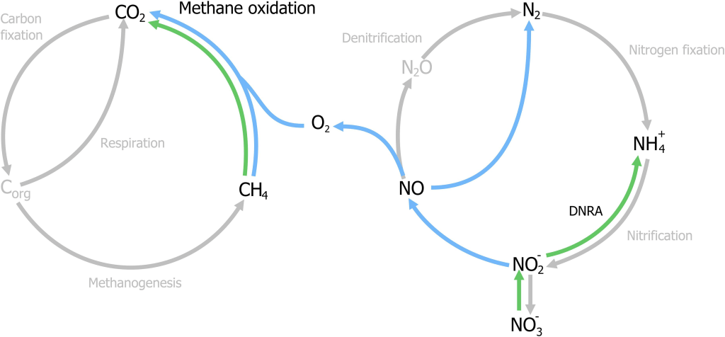 Methanotrophs are bacteria and archaea that are capable of oxidizing methane through a process called methanotrophy and turning the greenhouse gas into carbon dioxide as well as several other by-products. This is possible under certain conditions due to particulate and soluble methane monooxygenases (pMMO’s and sMMO’s). Two different classifications of methanotrophs exist -aerobes and anaerobes. The end result is the same in that methane is transformed into carbon dioxide. The main difference is that aerobic, or oxygen-dependent methanotrophs, rely solely upon oxygen to perform this chemical reaction, whereas anaerobic methanotrophs initially use nitrogen based compounds to eventually oxidize methane. Many different species of methanotrophs have been found in a variety of biomes, from deep rock ground water to hot springs to salt lakes.