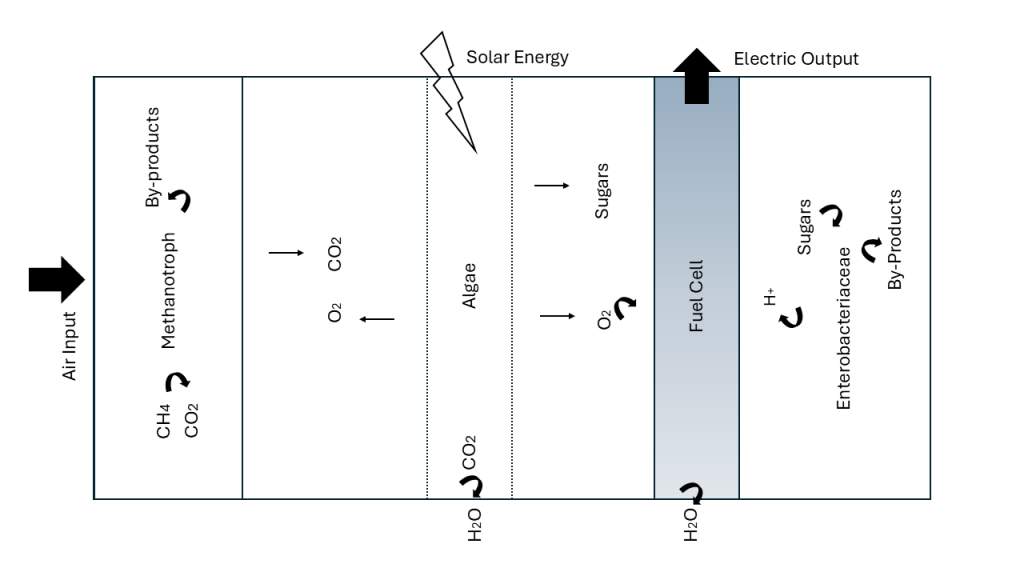The input carbon dioxide and methane would be separated and vented to their respective locations. For this proposed model, the methanotroph of choice would be Methylococcus capsulatus, as it is well studied, it is capable of growth in media, and it is an obligate aerobe that would utilize the oxygen from the algae to produce carbon dioxide. The carbon dioxide generated from the M. capsulatus and the initial carbon dioxide from the air input would be fed to the algae of choice, which is Chlorella vulgaris. C. vulgaris is a microalgae that is efficient at carbon dioxide capture, is capable of generating multiple sugars that can be utilized by various Enterobacteriaceae, and can generate biomass that can be repurposed for other forms of renewable forms of energy such as biofuel. C. vulgaris, through photosynthesis and utilization of both sources of carbon dioxide, would generate oxygen necessary for both the oxidation of the methane by the M. capsulatus and for chemical reactions of the fuel cell to generate the electrical energy. The Enterobacteriaceae for this platform would be Enterobacter aerogenes, as this bacterium is capable of utilizing sugars produced by C. vulgaris and has a high hydrogen conversion rate under anaerobic conditions. The hydrogen generated from the E. aerogenes would be fed into the fuel cell to interact with the oxygen from the C. vulgaris to generate electricity, as well as by-products of heat and water.